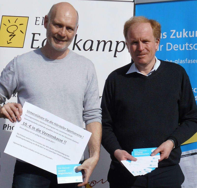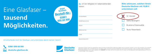 Im Zuge der Nachfragebündelung zum Bau eines flächendeckenden Glasfasernetzes konnte der SC Hörstel die Unternehmensgruppe Deutsche Glasfaser als Sponsor gewinnen. Der Verein könnte eine Prämie über 10,00 EUR bekommen, wenn ein Mitglied einen Vertrag abschließt.