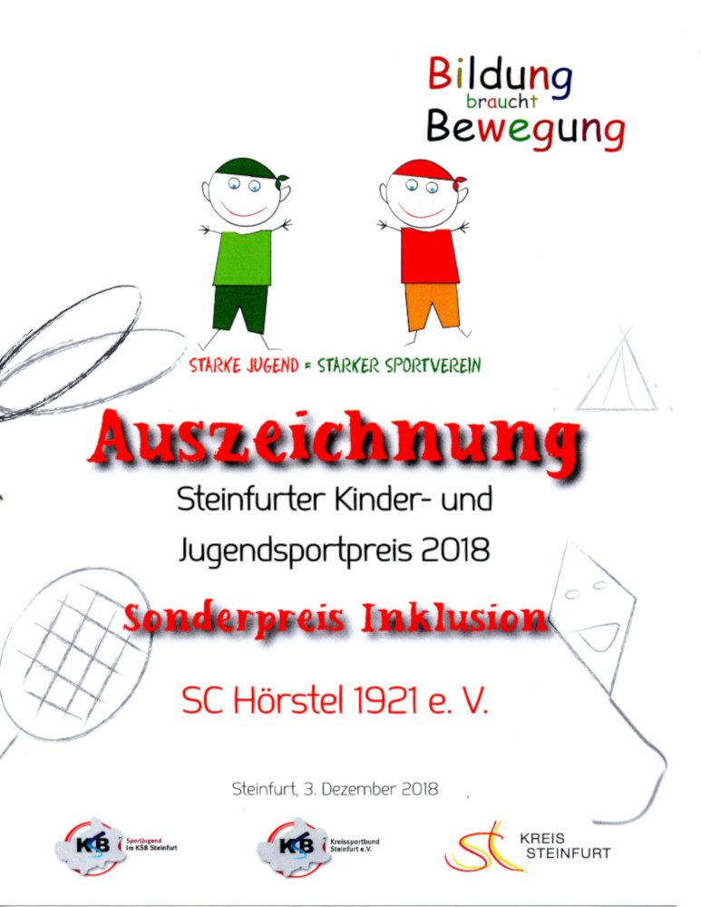 Für das Projekt „Inklusion beim SC Hörstel – Ausbildung von Menschen mit Behinderung zu Assistenztrainern“ erhielt der SC die erstmalig ausgelobte Sonderförderung Inklusion.