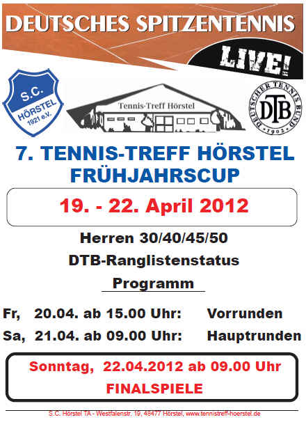Zum 7. Tennis-Treff Frühjahrscup vom 17.-22.04.2012 wird wieder ein Top-Teilnehmerfeld mit einigen der besten Herren (AK 30/40/45/50) erwartet.