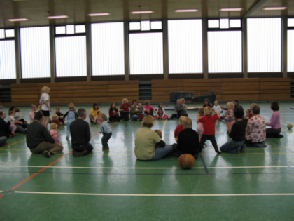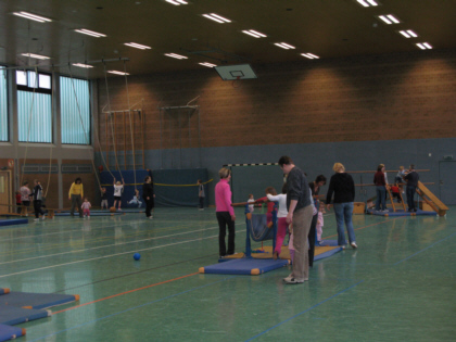 Wir machen einen Anfangs- und Abschlußkreis mit Sing- und Bewegungsspielen, errichten eine Bewegungsbaustelle, um das Erlernen vielfältiger elementarer Bewegungsfertigkeiten, wie das Hüpfen, Krabbeln, Beugen, Fangen, Werfen, Klettern, Steigen, Rutschen, Schwingen, Gleiten, Balancieren usw. zu ermöglichen, fördern soziale Kontakte.