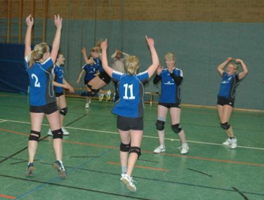 Im ersten Satz lief dennoch alles nach Plan für den Spitzenreiter. Nach ausgeglichenem Beginn waren es einmal mehr die druckvollen Angaben, die den Satz mit 25:20 zugunsten des SC entschieden. Aber die hoch motivierten Stella-Damen ließen sich dadurch nicht beeindrucken und hatten nach dem Seitenwechsel ihre beste Phase. Über 10:5, 15:6 und 23:12 holte sich die Basner-Sechs den zweiten Durchgang mit 25:17. „Mehr Biss, mehr Biss“, forderte SC-Coach Manfred Heeger beim Seitenwechsel und seine Damen enttäuschten ihn nicht. Die Einwechselung von Routinier Karin Mergenschröer brachte endlich mehr Ruhe und Sicherheit ins Hörsteler Spiel. Die Fehlerquote sank, während bei Bevergern das hohe Niveau des zweiten Satzes keine Fortsetzung fand. Bis zum 15:17 kämpften sich die Stella-Damen immer wieder heran, dann war es Karin Mergenschröer, die ihr Team mit taktisch guten Angaben auf die Siegerstrasse brachte und maßgeblich zum 25:16-Erfolg beitrug. Ganz ähnlich verlief der vierte Durchgang. Hörstel lag zwar von Beginn an mit zwei bis drei Zählern vorn, konnte die kampfstarken Gäste aber nicht abschütteln. Erst in der Schlussphase setzte sich der Siegeswille des Spitzenreiters durch. Um exakt 21:55 Uhr verwandelte die Heeger-Sechs gleich ihren ersten Matchball zum 25:19-Erfolg.